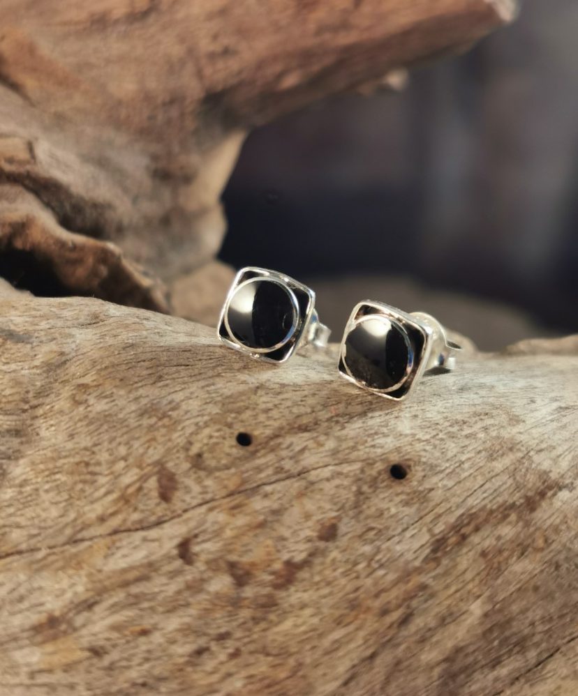 A 6mm square sterling silver stud earring set with a 4mm round Whitby Jet stone.