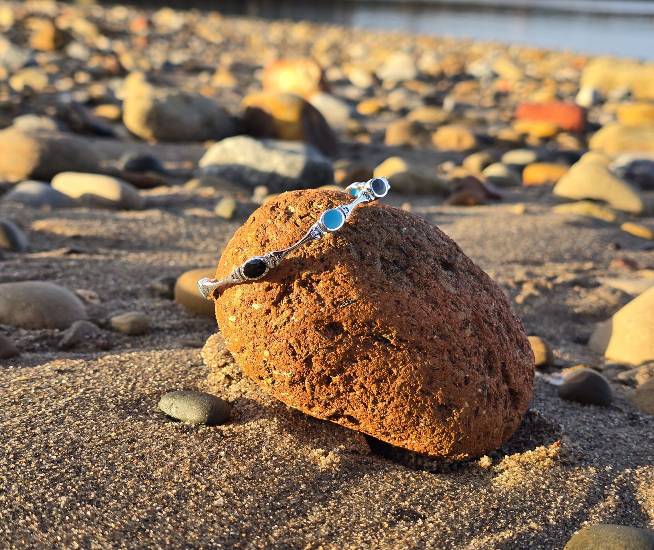 A striking combination of Whitby Jet and Arizonan turquoise in this sterling silver bracelet. The length is 7.25-7.75 courtesy of the extension chain. The stones measure