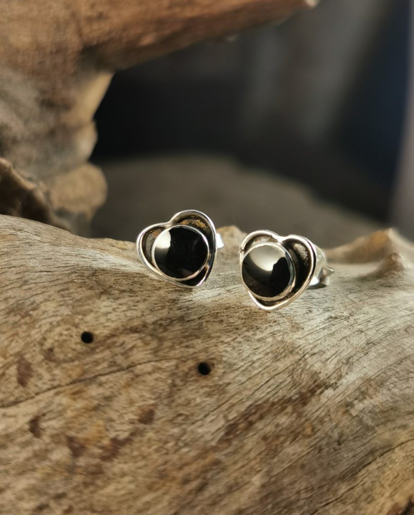 A cute pair of Whitby Jet and Sterling Silver Small round heart studs .
